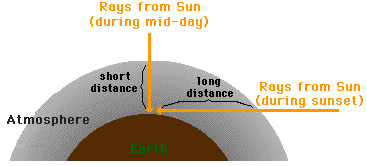 Ever wondered why the Sun appears red on the sunset? On the visible to the human eye light spectrum, when the Sun is above us in the sky, light has to travel a shorter distance through Earth’s atmosphere to reach our retina. The short wavelength high frequency part of the spectrum is able to reach us, corroborating our sensitivity to blue frequencies scattered and deflected several times, resulting in the blue skies we see. The sun, emitting light of mostly yellow frequencies, also appears to us yellow when it is above us in the sky.